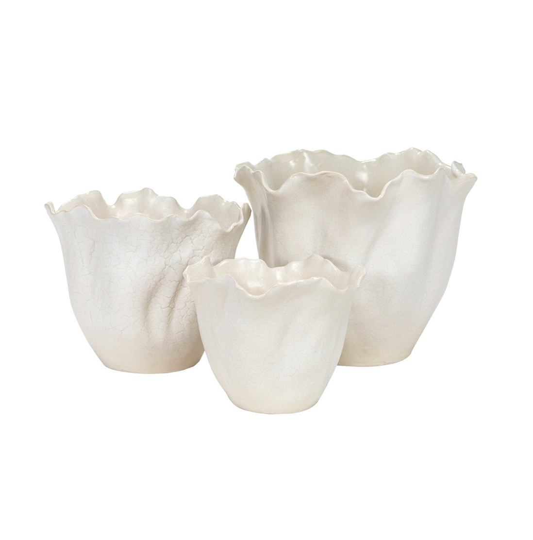 The Flora White Stoneware Planters bring organic elegance to any living sanctuary with their stunning coral-inspired design. Crafted from premium stoneware with delicate wavy edges and a distinctive crackled exterior pattern, these sophisticated vessels create a perfect backdrop for lush greenery, vibrant blooms, or striking succulents. The textured white finish complements both contemporary and traditional decor styles while adding subtle visual interest to shelves, tables, or floor displays. Available as a set of three complementary sizes—small (10"Dia x 8"H), medium (12"Dia x 10"H), and large (16"Dia x 12"H)—these versatile planters allow for creative arrangements throughout your space. Whether displayed together as a collection or positioned individually as statement pieces, the Flora Planters effortlessly infuse natural beauty and refined style into any room, instantly breathing life into your space.
